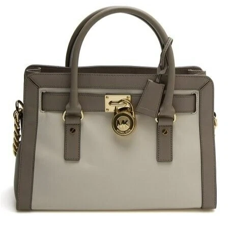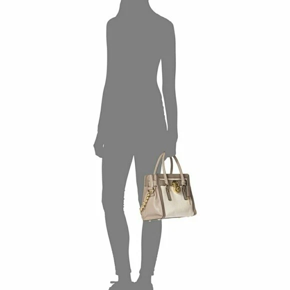 Features: Smooth calfskin leather adds a sleek finishing touch to this chic tote bag from MICHAEL Michael Kors. The MICHAEL Michael Kors Hamilton Medium EW satchel bag is made from the rich top quality leather, a horizontal strap woven around the top of the bag, a MK logo padlock accent on the front, and a chunky chain link trimmed shoulder strap. This tote bag has a roomy main compartment with a magnetic snap closure and a fully lined interior that includes a key clip, a back wall zipper pocket, and multipurpose slide pockets. Dual top handles and a shoulder strap offer versatile and comfortable carrying options.
