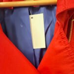 The coat is finished with luxurious gold-tone hardware, including an “MK” logo zipper pull, and features a contrasting navy blue lining that pops against the red exterior.