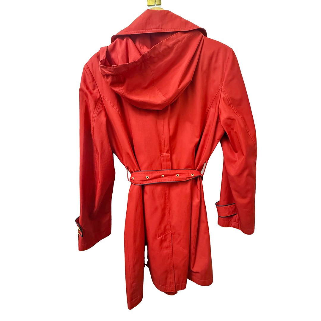 Make a statement in this vibrant red Michael Kors trench coat. Designed with a flattering fit-and-flare silhouette, this coat features a stylish asymmetrical “moto-style” zipper and a waist-cinching belt with navy blue piping for a nautical touch. The attached hood and durable fabric make it perfect for rainy days or transitional weather.