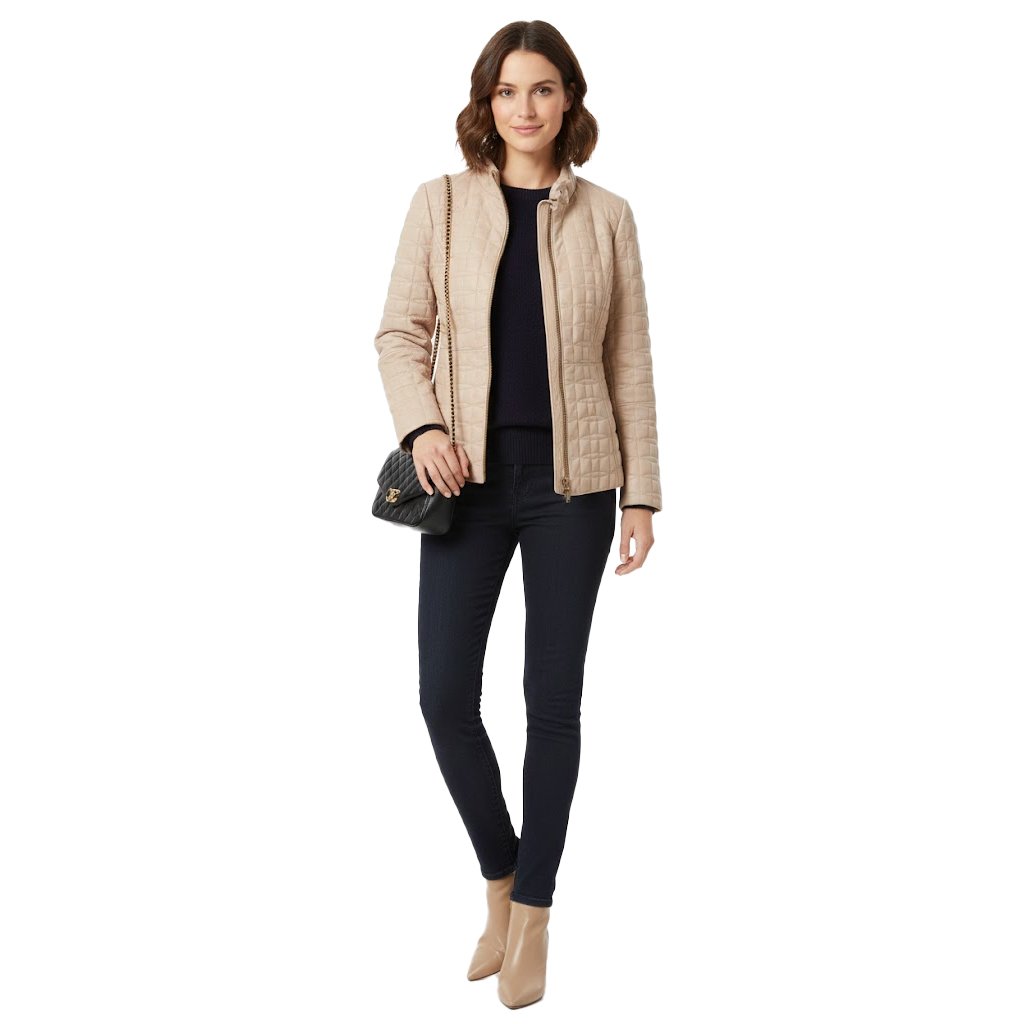 Crafted from a soft, plush quilted fabric in a beautiful light pink hue, this jacket provides a gentle and comfortable feel while offering a structured and tailored fit. The quilted pattern adds a subtle texture and visual interest, elevating it beyond a simple jacket. The classic moto-style details—including an asymmetrical front zipper and sleek silver-tone hardware on the zips and pockets—add a bold, contemporary edge that contrasts beautifully with the soft color.