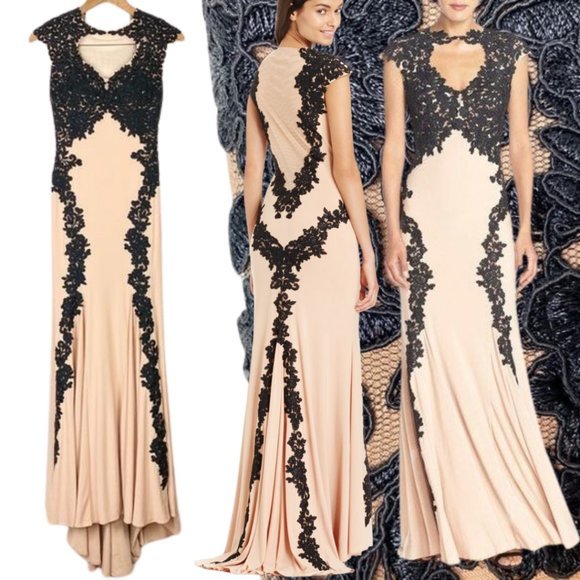Chic Betsy & Adam champagne and black gown. Lace detail to the top with trailing vines down the skirt. Keyhole chest detail, short almost cap like sleeves. Collar detail hooks together the lace. Plunging back with nude-champagne lace to support without losing the structure of the back. Bustle-like gathering in the back. Size 8 with a fair amount of stretch.