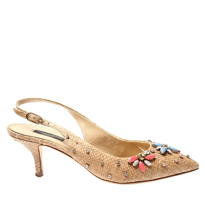 hese are the Dolce & Gabbana Flower Bijou Slingback Pumps, also referred to as the Dolce&Gabbana Flower-Detailed Woven Slingback Pumps.